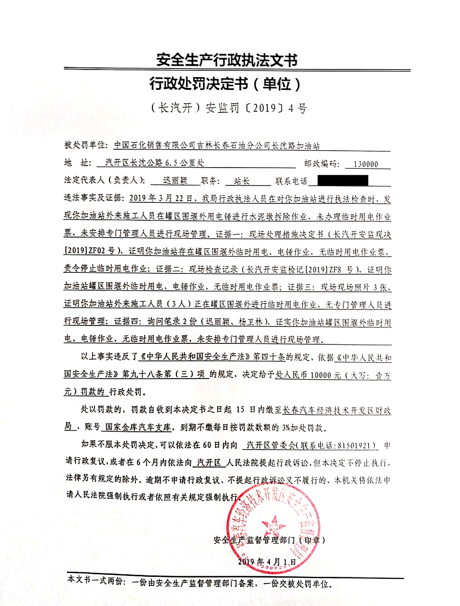 安全生产行政处罚信息公示_长汽开安监罚[2019]4号(单位)